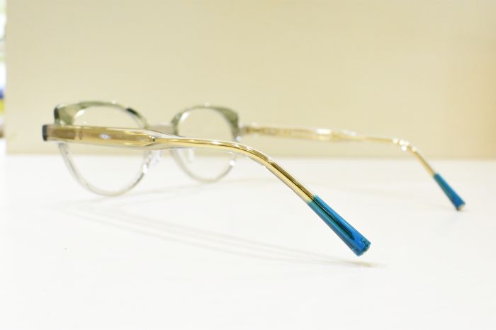 フォックスシェイプが特徴で、今回のカラーはクリアグリーンをベースとしたハバナカラーで、涼し気な印象を感じるデザインとなっています。