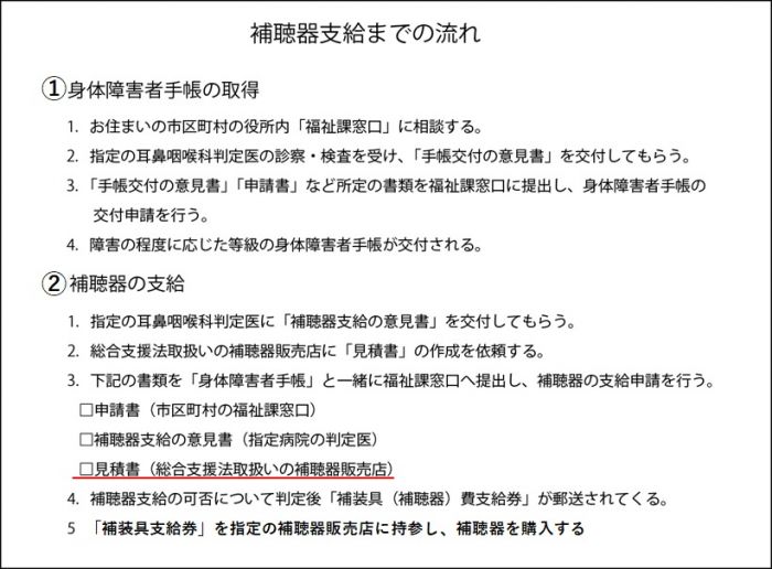 流れとしては①障害者手帳の取得と②補聴器の支給の2種類の手続きが必要となります。