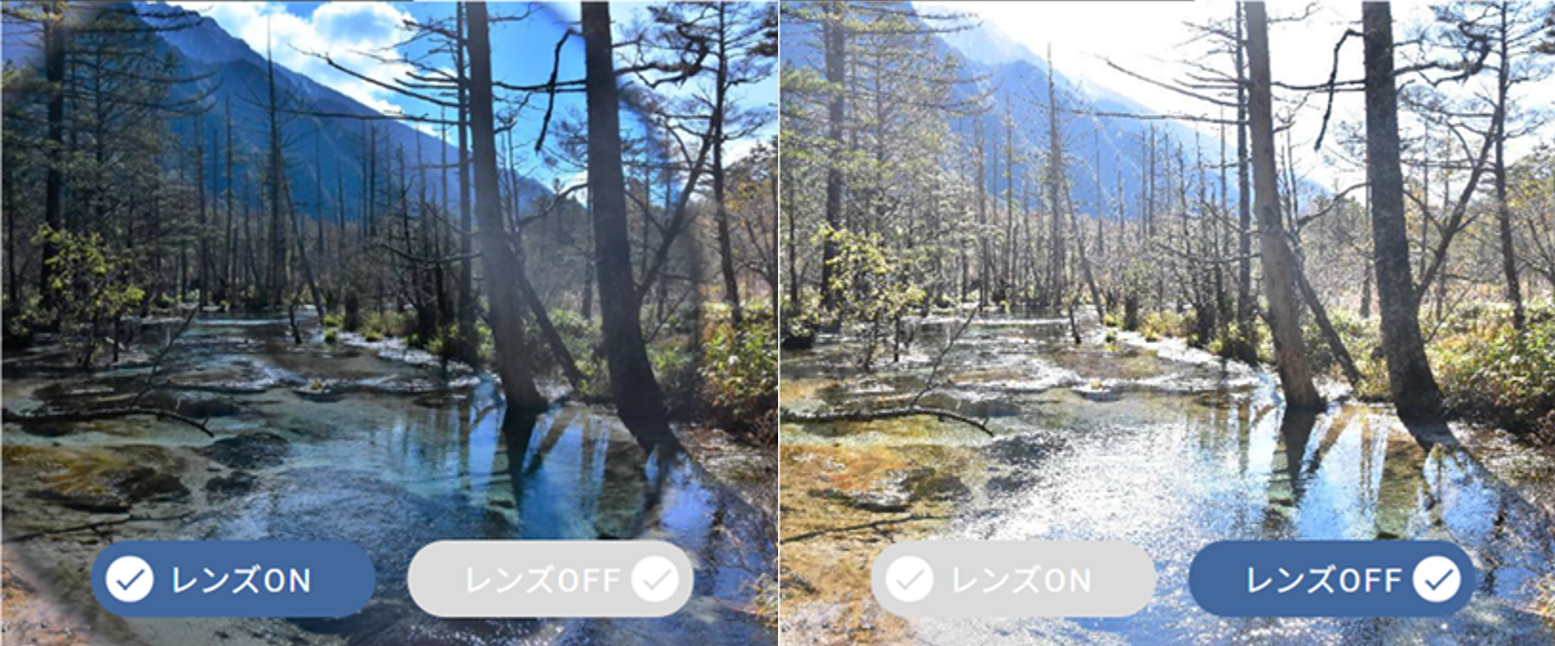 ヨード系原料を用いることで高い雑光カット率と可視光線透過率を実現する事に成功し、0.03mmという極薄のフィルターを通すことで、限りなく目に優しい視界を実現しています。